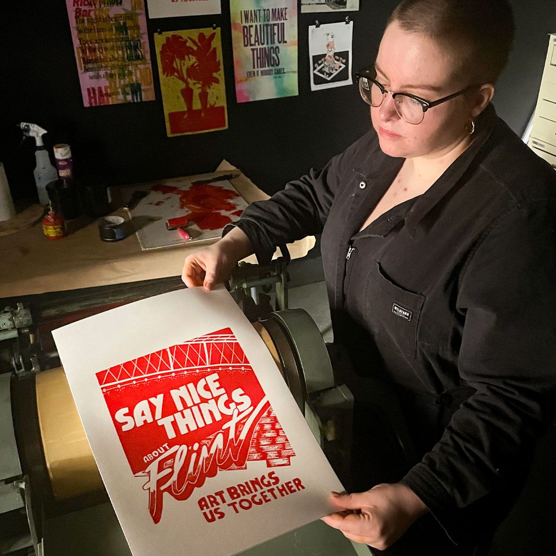 Janice hopes that her residency will bring attention to the necessity of creative work as part of being human, especially in her exploration of the Flint community and landscape and her education on the process and power of printmaking.